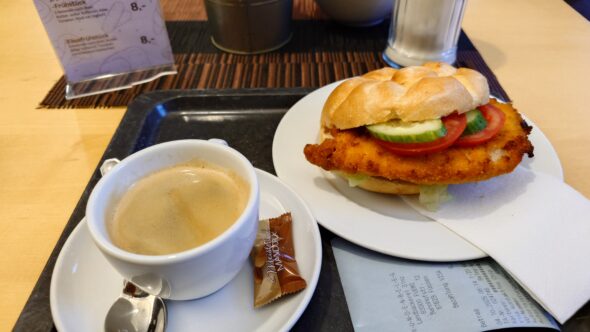 シュニッツェルのサンドイッチ(5ユーロ)+アメリカンコーヒーで6ユーロほど。