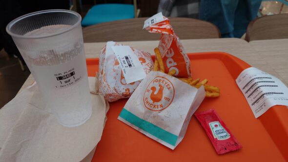 まずは3階のPopeyes(ポパイズ)で昼食。日本には未上陸のチキン専門店で、バーガーと手羽3ピース、ポテトとドリンクのセットで約12ユーロ。ポテトには辛くないけれどスパイスが効いていて、クセになる味。ボリュームも十分で、価格は他のお店の外食と同程度ですが満足度は高いです。
