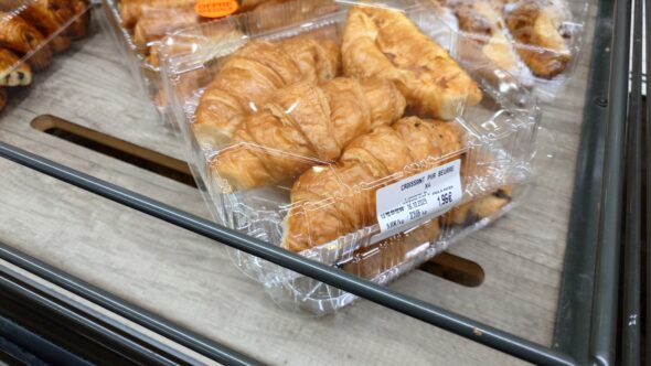 今日の買い物はクロワッサン、ピタラップ、水の3点で約6ユーロ。節約を意識しながら、食生活の選択肢が増えるのはありがたいです。