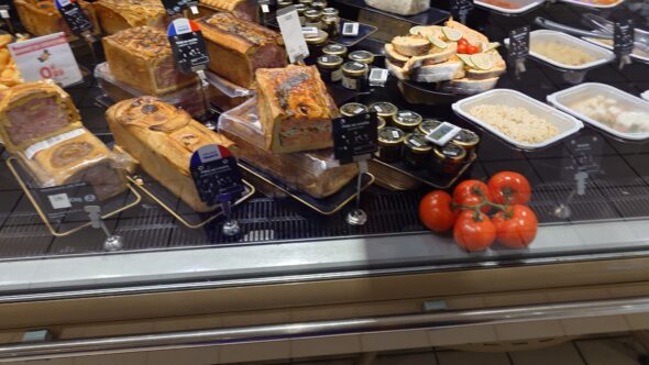 惣菜コーナーにはソーセージやパテ、キッシュなどが並び、調理済みの肉類も豊富。特に印象的だったのが鮮魚コーナーです。氷の上に多種多様な魚が並び、切り身も冷蔵棚に整然と並んでいました。