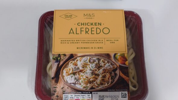 夕食はM&Sの冷蔵アルフレードパスタ、紅茶はYorkshire Tea