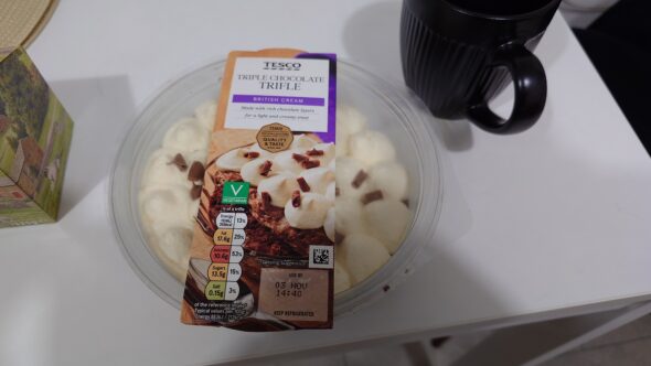 夜はM&Sの冷蔵マカロニチーズ、ヨークシャーティ、そしてTescoのchocolate trifle。