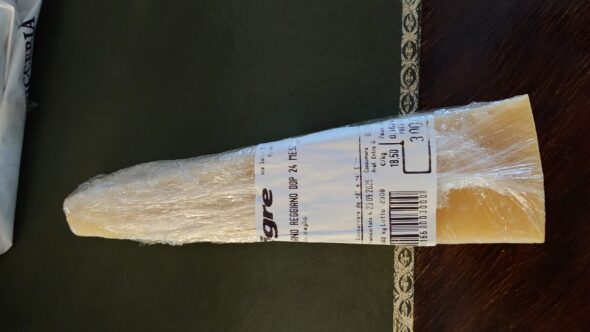 体調が悪かったので早めに切り上げ、スーパーで買い物をしてブログ更新にあてることに。そこで見つけたのが、パルミジャーノ・レッジャーノ。1kgで19ユーロしないくらい、日本だと6000円近くするので即購入。荷物は増えるけど、ハードチーズだから帰国まで問題ないはず。パスタに入れても、そのまま食べても最高のイタリアチーズの王様。