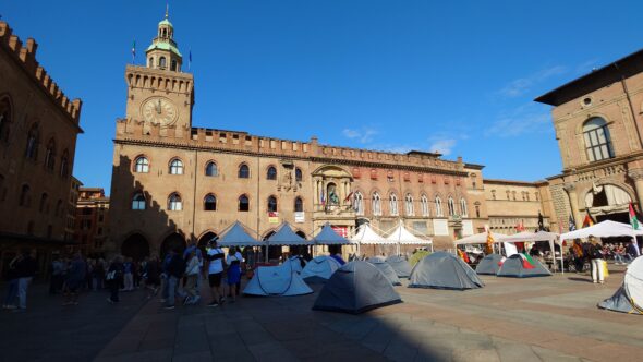 まず足を運んだのはマッジョーレ広場。ボローニャの象徴的な場所だけあって観光客でにぎわっています。石畳に座って写真を撮る人、観光ガイドの旗を追う団体、のんびりジェラートを食べる家族連れ。多国籍な人の流れを眺めているだけで街の空気が伝わります。何故か広場の中央にはテントがいっぱい張ってありました。