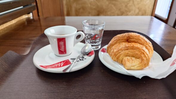 昼食を求めて駅近くをぶらつくも、ビアバーは閉店中。仕方なく近くのバールへ。注文したのはエスプレッソとコルネット(クロワッサン)。2つでわずか3ユーロ。