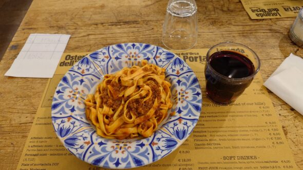 注文したのは名物のタリアテッレ・アル・ラグー(日本では“ボロネーゼ”)。濃厚な牛肉の旨味と赤ワインが抜群に合い、トマト感よりも肉の味が際立ちます。「これが本場のボロネーゼか」と唸りました。値段はワインと合わせて11ユーロちょっとぐらいでした。